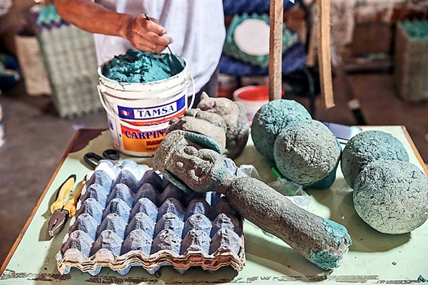 Provisto de una cuchara común y corriente, Ever Rodríguez Prado va dando forma a estas figuras. La pasta, que es el magma de sus criaturas, es un combinado resultante de las jabas de huevo remojadas en agua y mezcladas con cola de madera que chanca, remueve y almacena en un balde de pintura.