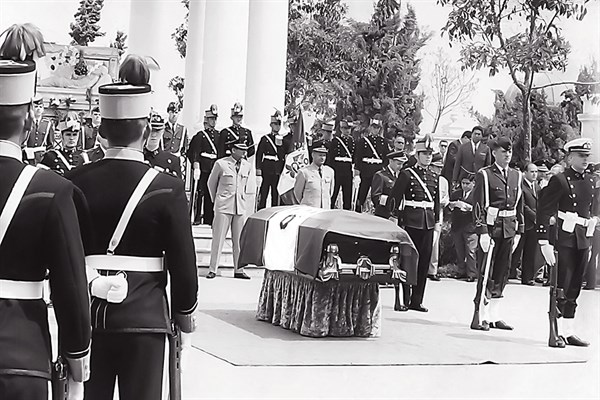 A las cuatro de la tarde, la larga caravana, con sus coronas de flores, cruzaba Lima rumbo al Presbítero Maestro. Ya en la necrópolis, el féretro avanzó cubierto por la bandera peruana y secundado por tres cadetes que llevaban en almohadones rojos sus insignias, casco y bastón de mando del grado de mariscal. Las bandas de músicos de las tres FF. AA. interpretaron al unísono la marcha fúnebre “Morán”.