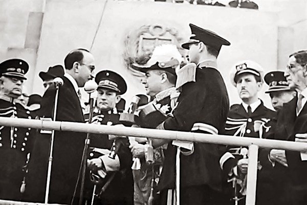 “En nombre de la nación, os hago entrega de la insignia de vuestra suprema jerarquía que os erige en el primer soldado de la República. La jerarquía es, a la vez, honor y compromiso. De ahí que por el influjo de vuestro ejemplo y por la acción de vuestra autoridad estéis llamado a personificar los caracteres de unidad y disciplina, que son fundamentos esenciales de los institutos armados”, dijo Bustamante.