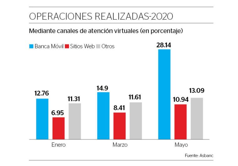 De acuerdo con un reporte de la Asociación de Bancos (Asbanc), hasta mayo de este año, el 52.2% de las transacciones bancarias se realizo´ mediante canales de atención virtual. De este porcentaje, la banca móvil constituyo´ el 28.1% mientras que la web comprendió el 10.9%.