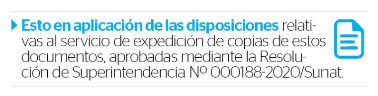 Esto en aplicación de las disposiciones relativas al servicio de expedición de copias de estos documentos, aprobadas mediante la Resolución de Superintendencia Nº 000188-2020/Sunat, con la cual se regulan la forma, plazos y condiciones en que aquellos administrados podrán solicitar y recabar tales copias.