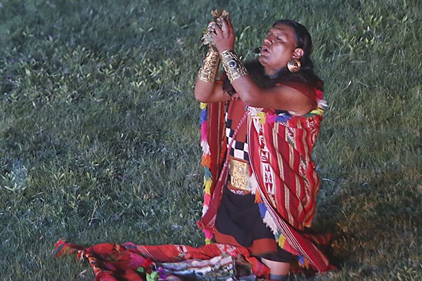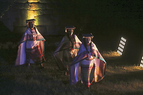 Entre graves bombos, agudas quenas y pututus, se dio una ofrenda a la Pachamama, la madre tierra, al estilo cusqueño. Mientras el sacerdote inca oficiaba el simbólico acto, los danzarines eran una metáfora de cóndores de alas blancas y pechos rojos, que volaban, mientras las ‘vírgenes del Sol’ se unían a la ceremonia, bailando en honor a la ciudadela, piedra angular de la civilización inca y andina.