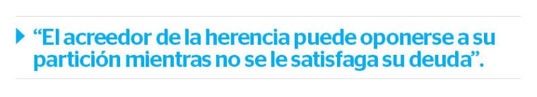 A su vez, advierte que aquel artículo legitima al acreedor de la herencia para que la oposición a la partición y al pago o entrega de los legados, mientras no se le satisfaga su deuda, pueda ejercerla en un nuevo proceso o en el proceso existente como tercero con interés.