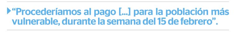 “Lo que hemos anunciado es que la plataforma de consulta para que los ciudadanos y ciudadanas puedan saber si son receptores del bono, estaría habilitada el 15 de febrero. Procederíamos al pago, digamos del primer tramo, para la población más vulnerable, durante la semana del 15 de febrero”, manifestó Vargas.