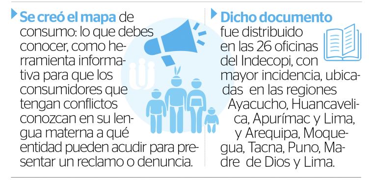 Desde hace años, el Indecopi impulsa diversas actividades en materia de protección al consumidor dirigidas a los pueblos indígenas del Perú, bajo los enfoques de derechos, interculturalidad e Intersectorialidad, conforme a lo señalado en el Código de Protección y Defensa del Consumidor, Ley Nº 29571. Estas actividades sobre protección al consumidor se realizan como parte de la Política Nacional de Protección y Defensa del Consumidor, que fomenta que los consumidores conozcan sus derechos y dispongan de información relevante para tomar mejores decisiones de consumo; y el Plan Nacional de Protección del Consumidor, el punto referido a educación, orientación y difusión. Al respecto se desarrollan programas radiales sobre materias de competencia del Indecopi con traducción al quechua y al aimara. En materia de protección al consumidor, el Indecopi también ha difundido alertas en quechua, aimara y awajun sobre productos y servicios irregulares, práctica que se institucionalizará en el presente año para consolidar la inclusión de los pueblos originarios.