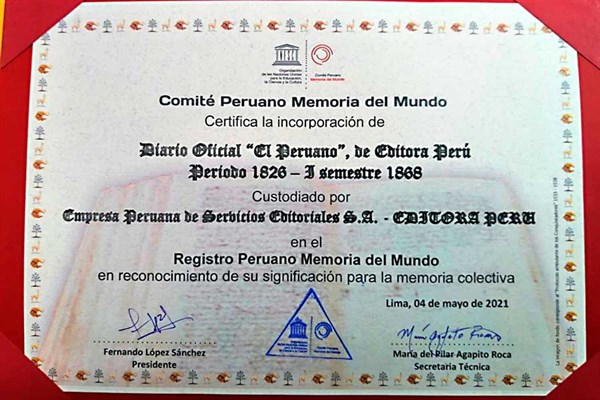 Se trata del Certificado de Incorporación del Corpus Documental Diario Oficial El Peruano de Editora Perú Período 1826- I semestre 1868 a ser incorporado en el Registro Peruano Memoria del Mundo-Unesco.