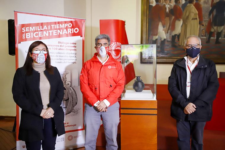 “La Semilla del Tiempo nos permite pensar en el futuro, en ese país que queremos para las futuras generaciones. Junto al Proyecto Especial Bicentenario y la Marina de Guerra, a través del Sima, se ha logrado contar con una semilla del tiempo. Será un contenedor que representa a una cerámica inca Chimú, que alojará las propuestas del país y peruanos en el mundo. En 100 años se abrirá y esa generación sabrá cómo fue el Perú del bicentenario”, destacó el ministro.