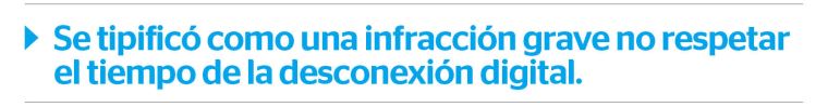 Finalmente, en marzo del 2021 se tipificó como una infracción grave no respetar el tiempo de desconexión digital (asignar tareas, establecer coordinaciones o exigir mantener encendidos herramientas tecnológicas); ejerciendo actos de coerción y/o intimidación sobre los colaboradores. La multa que eventualmente podría imponerse ante la configuración de esta infracción oscilará entre los 6,908 y 114,928 soles.