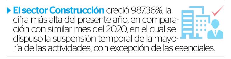 “Debemos señalar que el resultado tiene como base de comparación abril del 2020, mes que registró una pronunciada contracción productiva (-39.09%), debido a la cuarentena por el covid-19 en el país”, precisó.