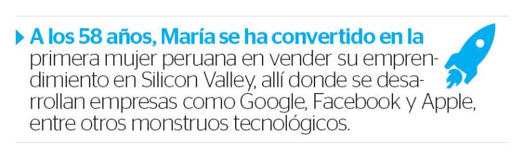 A los 58 años, María se ha convertido en la primera mujer peruana en vender su emprendimiento en Silicon Valley, allí donde se desarrollan empresas como Google, Facebook y Apple, entre otros monstruos tecnológicos.
