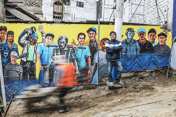 1. El San Cristóbal se pone pintón. En la esquina de la dos de la avenida Leticia, frente a la canchita de arena y la capilla, un mural da la bienvenida y muestra el orgullo del barrio. Edgar Macedo quiso rendirle tributo al señor Gambito y don Marcelino, y con ellos, al personaje emblemático que permitió el desarrollo de estas laderas del San Cristóbal: el cargador.