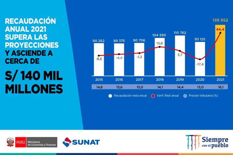 Sunat: recaudación anual 2021 supera proyecciones y asciende a casi S/ 140,000 millones