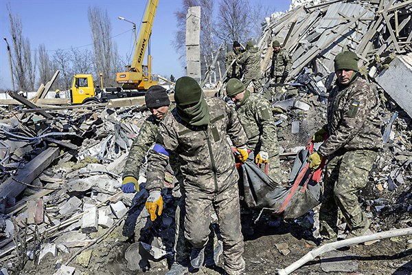 Bombardeos. Una escena que se ha vuelto cotidiana en este primer mes de guerra, rescatistas retiran a víctima de los escombros.