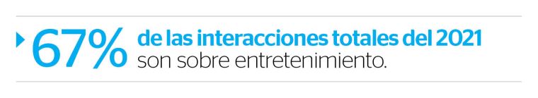 Con respecto a las publicaciones latinoamericanas monitoreadas por Comscore y hechas en Facebook, Twitter e Instagram durante 2021, los posteos generaron 29,800 millones de interacciones por parte de la audiencia, lo que equivale a 81 millones de interacciones diarias durante 2021. Continuando con la tendencia marcada a partir del 2020, Instagram se queda con un 68% del share de acciones por canal social, contra un 26% de Facebook y 6% de Twitter.