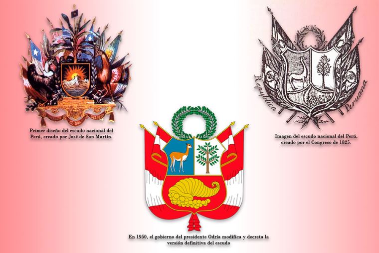 Respecto al escudo, dicha ley dice en su artículo primero: "Las armas de la Nación peruana constarán de un escudo dividido en tres campos: uno azul celeste a la derecha, que llevará una vicuña mirando al interior; otro blanco a la izquierda, donde se colocará el árbol de la quina; y otro rojo inferior y más pequeño en que se verá una cornucopia derramando monedas, significándose, con estos símbolos las preciosidades del Perú en los tres reinos naturales.