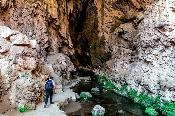 Nos aproximamos a una gran cueva con una boca de 20.5 metros de alto por 30 metros de ancho y 3,050 metros de profundidad. En su interior se aprecian antiguas pinturas rupestres y variadas espeleoformas.