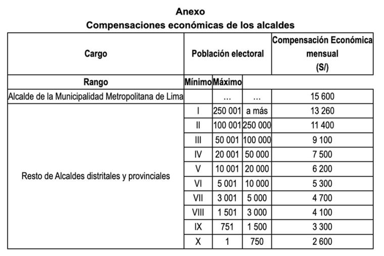 Para los alcaldes provinciales y distritales el resto del país, las compensaciones económicas van desde los S/ 2,600 mensuales a los S/ 13,260 mensuales, de acuerdo al tamaño de su población electoral.