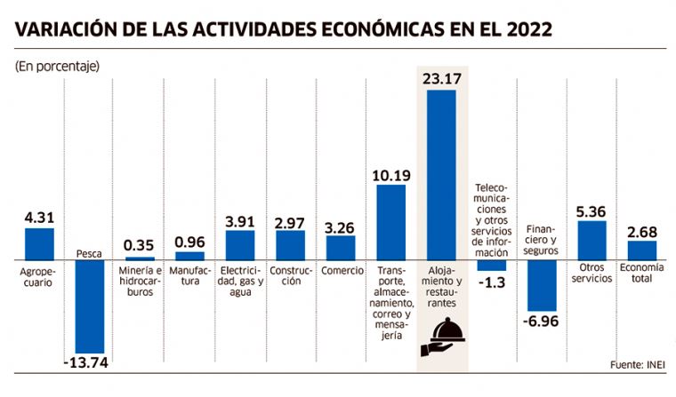 El sector servicios, que incluye a los servicios de transportes y alojamiento y restaurantes, presentó un desempeño positivo en el 2022, en parte por un efecto base debido a que las restricciones a la movilidad aún se mantuvieron durante parte del 2021.
