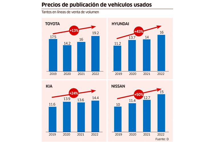 En cuanto a las marcas de autos usados, también se observó incrementos diferenciados en sus precios. Así, el valor de un auto usado de la marca Toyota creció 13% entre el 2019 y el 2022 (de 17,500 a 19,200 dólares); el de Hyundai reportó un alza de 43% en ese periodo (de 11,200 a 16,000 dólares), mientras que el precio del auto KIA creció 24% (11,600 a 14,400 dólares) y de Nissan lo hizo en 50% (de 10,000 a 15,000 dólares).