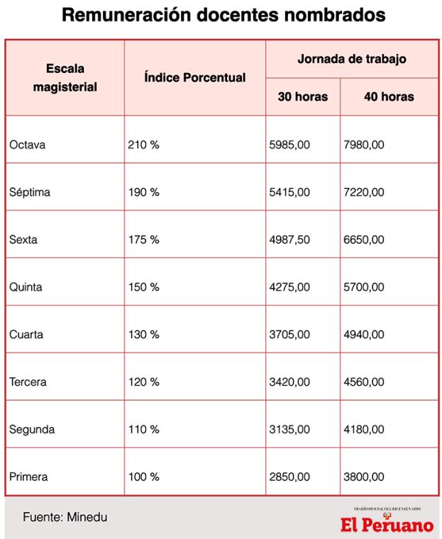 Este incremento, regulado por Decreto Supremo 036-2023-EF, fija la remuneración de los docentes nombrados con jornada de 30 horas entre S/ 2,850, en la primera escala magisterial, y S/ 5,985, en la octava; mientras que los docentes con jornada de 40 horas percibirán entre S/ 3,800 y S/ 7,980.