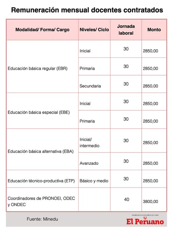 Sin embargo, el profesor contratado que labore menos horas de la jornada laboral establecida para la modalidad, forma, nivel o ciclo en que presta sus servicios, percibirá la remuneración mensual de forma proporcional a las horas contratadas, indica el decreto.