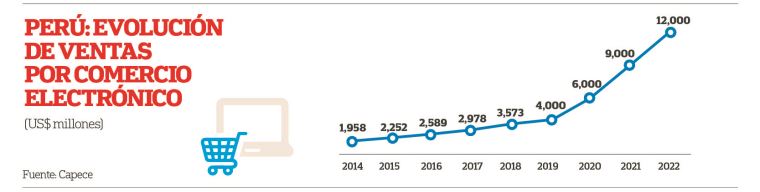 Las ventas por comercio electrónico crecieron de manera casi exponencial desde el 2020 y han alcanzado en el 2022 los 12,000 millones de dólares, tres veces más que al comienzo de la pandemia. En ese mismo año, el 46% de los peruanos había hecho alguna compra online.