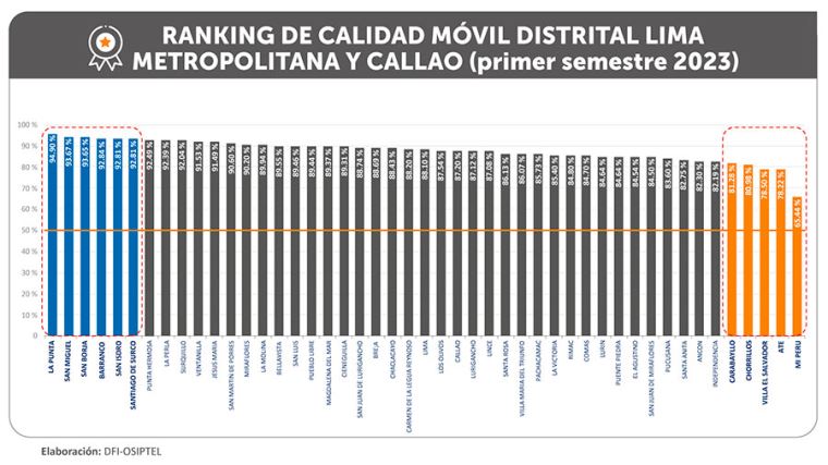 Al otro lado de la tabla, se ubicaron Carabayllo (81.28%), Chorrillos (80.98%), Villa El Salvador (78.50%), Ate (78.22%) y Mi Perú (65.44%), con menores indicadores de calidad móvil.