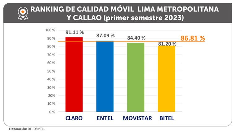 El promedio general de las operadoras, considerando su participación de mercado en líneas móviles al primer trimestre del 2023, llegó a 86.81%, lo que representó un incremento de 1.61 puntos porcentuales respecto a lo reportado el año pasado y de 5.22 puntos porcentuales respecto al 2021.