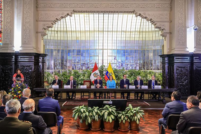 La presidenta de Perú, Dina Boluarte, y el mandatario de Ecuador, Guillermo Lasso, lideran la ceremonia de conmemoración del 25° aniversario de la firma de los Acuerdos de Paz de Brasilia, que resolvieron las diferencias limítrofes entre ambos países.