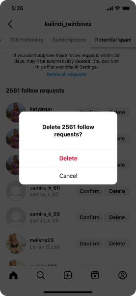 Todas las cuentas sospechosas de ser spam o bot que están impidiendo que te sigan se filtrarán automáticamente en una bandeja de entrada separada para que las revises, junto con los seguidores existentes que pensamos que pueden ser spam o cuentas bot. Si ves cuentas que crees que NO son spam, puedes aprobarlas y se añadirán a tus seguidores. Pero si estás seguro de que todas estas cuentas son spam o bots, sólo tienes que pulsar «Eliminar todos los seguidores spam» (o no hacer nada y las solicitudes se eliminarán automáticamente). Y no te preocupes, no recibirán ninguna alerta cuando su cuenta sea eliminada de tu lista de seguidores.