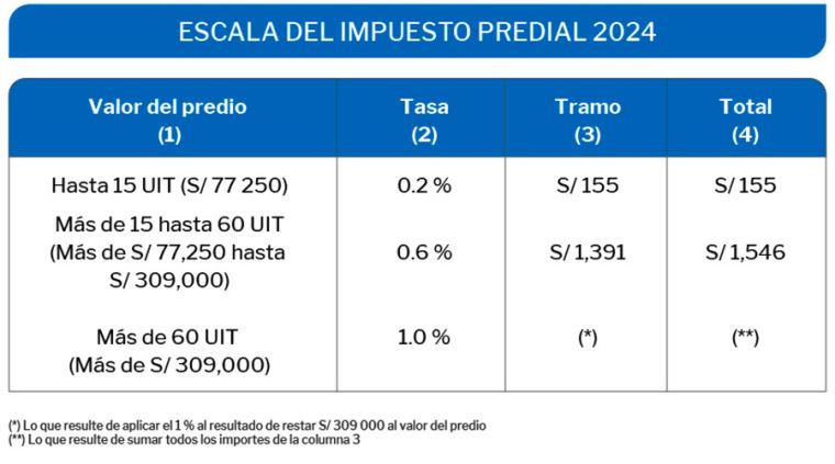 Además, al autoavalúo se le aplicará la escala del impuesto, considerando la UIT para el año 2024 (S/ 5 150), a fin de obtener el impuesto anual a pagar por el o los predios ubicados en cada distrito, lo que debe figurar en la cuponera respectiva.