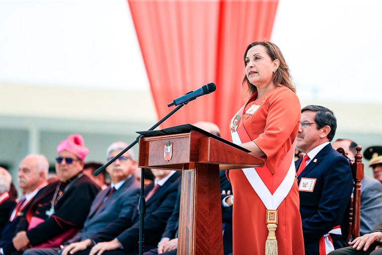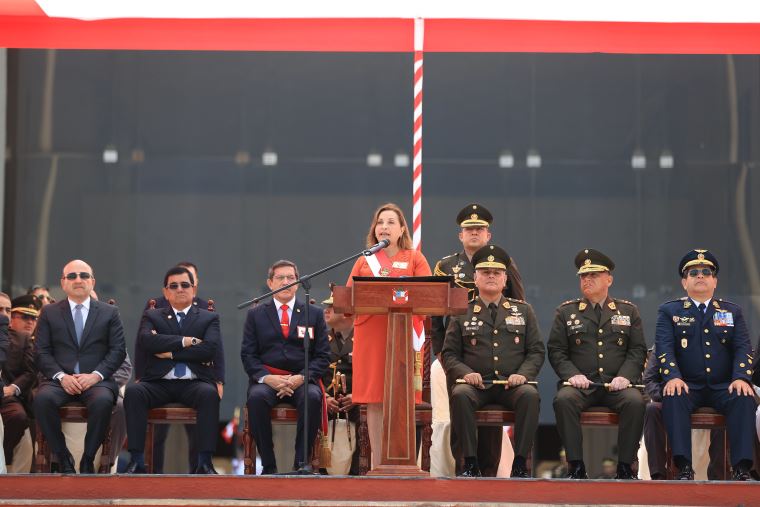 En la plaza Bolognesi, del Cuartel General del Ejército, en San Borja, la Mandataria destacó el papel que desempeñan las FF. AA. en el desarrollo del país y los retos que enfrentan ahora, como la lucha contra el terrorismo y el narcotráfico en el Vraem.