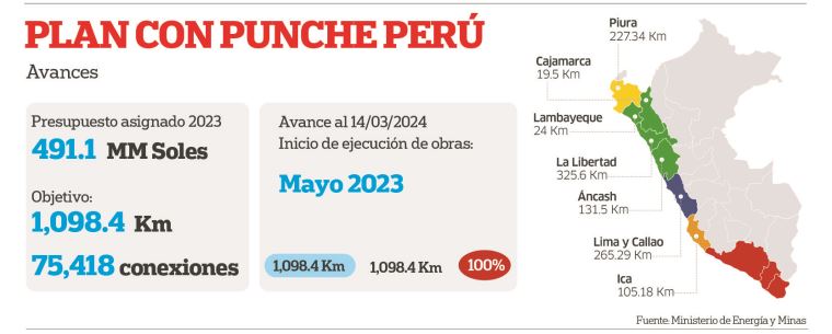 Esta semana, el Minem informó que se alcanzó la proyección trazada en una primera etapa del plan Con Punche Perú, lo que implica la distribución del gas natural en las regiones Áncash, Cajamarca, Ica, La Libertad, Lambayeque, Lima/Callao y Piura.
