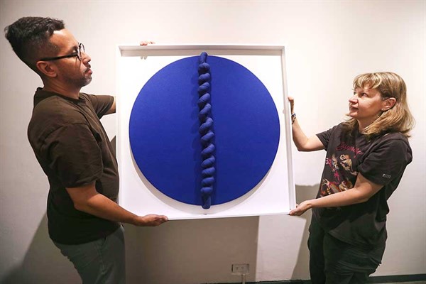 Una curiosidad es que se presentará en esta exposición un ejemplo de su serie de nudos. Es un círculo de tela azul, adherido a un lienzo, con un altorrelieve.