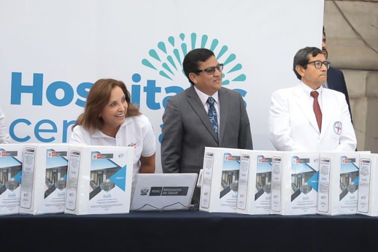 La jefa de Estado participó del lanzamiento del Plan Hospitales Centenarios en el Hospital Arzobispo Loayza, donde estuvo acompañado del ministro de Salud, César Vásquez.