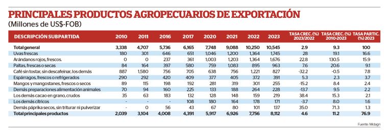 Sin embargo, de acuerdo con las cifras que maneja el Midagri, hay tres productos peruanos que se exportan y cuya performance anual supera o bordea los 1,000 millones de dólares: uvas, arándanos y paltas.