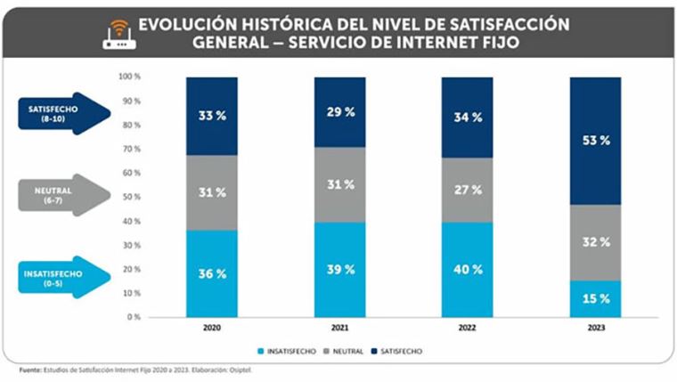 En tanto, el nivel de insatisfacción con el servicio de internet fijo mostró una reducción de 25 puntos porcentuales entre el 2022 y el 2023, alcanzando así solo un 15% de los usuarios encuestados.
