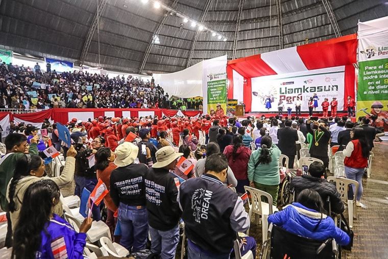 Desde el coliseo Manuel Odría, en la provincia de Tarma (Junín), la Mandataria informó que este programa financiará 1056 intervenciones inmediatas en 791 distritos a escala nacional, en beneficio de personas en pobreza y pobreza extrema.