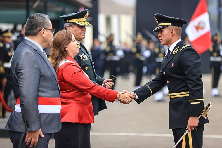 La mandataria participó en la graduación extraordinaria de alféreces de la Policía Nacional, ceremonia que contó con la participación de ministro de Interior, Juan Santiváñez, el ministro de Defensa, Enrique Astudillo, y el comandante general PNP, general Víctor Zanabria.