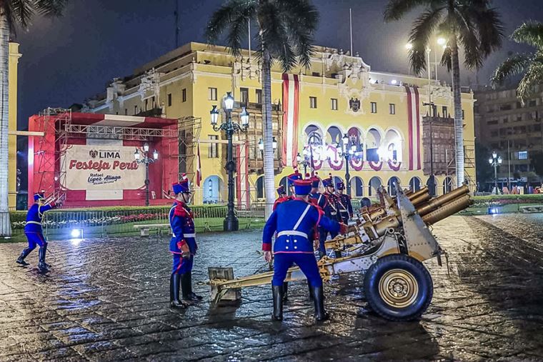 En el centro de la Plaza Mayor se han ubicado los efectivos de la Legión Peruana del Ejército, quienes estarán a cargo de ejecutar los 42 camaretazos, 21 a la salida de la presidenta de la República, Dina Boluarte de Palacio de Gobierno hacia la Catedral de Lima, y los otros 21 a su retorno a la Casa de Pizarro luego de la ceremonia religiosa.