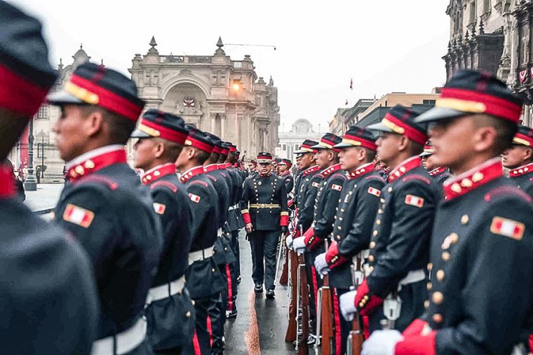 Mientras tanto, el perímetro de la Plaza está ocupado por diversos regimientos históricos de las Fuerzas Armadas y de la Policía Nacional del Perú (PNP).