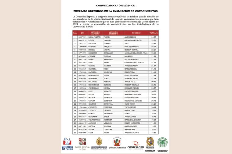 La comisión responsable de este proceso publicó los resultados de esta evaluación, que según las bases del concurso obtuvo un puntaje máximo de 30 puntos y que estuvo estructurada de 50 preguntas de opción múltiple distribuidas de la siguiente manera: un 50 % de interrogantes sobre aspectos relevantes en materia jurídica; 30 % sobre gestión pública y sistemas administrativos; y un 20% de preguntas referidas a cultura general, lo cual incluye el conocimiento de las instituciones del sistema de justicia y del sistema electoral.
