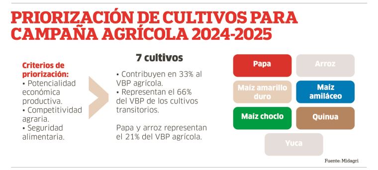 De acuerdo con el viceministro de Políticas y Supervisión del Desarrollo Agrario, Christian Garay Torres, el análisis del MOC se centra en siete cultivos estratégicos de importancia nacional: arroz, papa, maíz amarillo duro, maíz amiláceo, maíz choclo, quinua y yuca, que representan el 33% del valor bruto de la producción (VBP) agrícola.