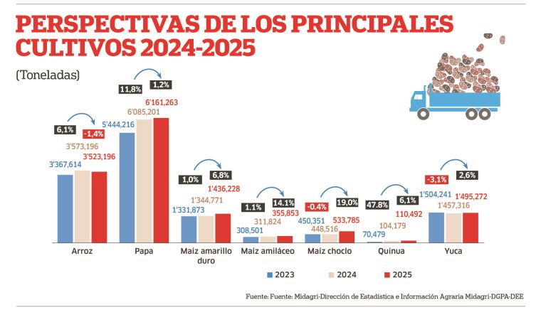 Se proyecta una recuperación significativa en la producción de cultivos clave como arroz, papa y quinua, con incrementos de hasta un 47.8%. Estos resultados positivos se deben a condiciones climáticas favorables y a las políticas de apoyo al sector agrícola.