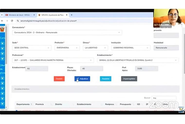El proceso de adjudicación de las plazas Serums se está llevando a cabo de manera virtual a través de la plataforma Zoom. Esta modalidad permite una mayor accesibilidad y transparencia en el proceso, facilitando la participación de los profesionales interesados desde cualquier parte del país. El Comité Central del Serums y el equipo técnico de la Dirección Ejecutiva de Planificación de Personal de Salud – Dirección General de Personal de la Salud (Digep) son los encargados de coordinar y conducir estas sesiones de adjudicación virtual.