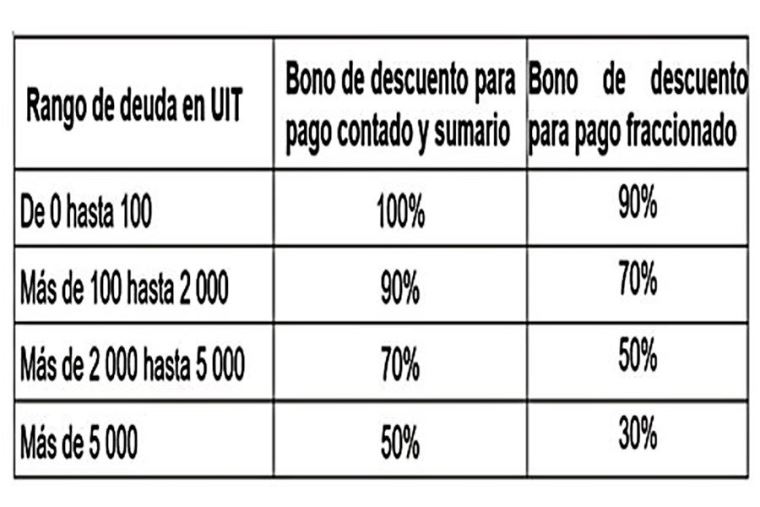 Los contribuyentes que se acojan a este fraccionamiento tributario especial accederán a un bono de descuento que estará en función del rango de las deudas, que va desde el 100 % hasta el 30 % sobre las multas e intereses, de modo que, los mayores porcentajes de descuento corresponderán a los contribuyentes con menores montos de deuda. El esquema aprobado es el siguiente: