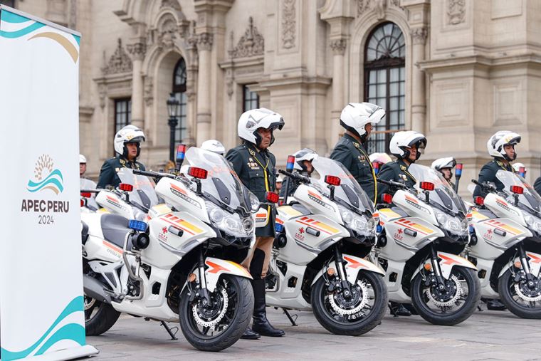 La Jefa del Estado presidió la ceremonia en la que China hizo entrega, en calidad de donación, de 110 vehículos, entre buses, motocicletas, y equipos informáticos, para ser usados por la Policía peruana en ese magno evento, que precisamente convocará en Lima a líderes mundiales de Estados Unidos, China Popular, Brasil, y de las otras 21 economías del bloque.