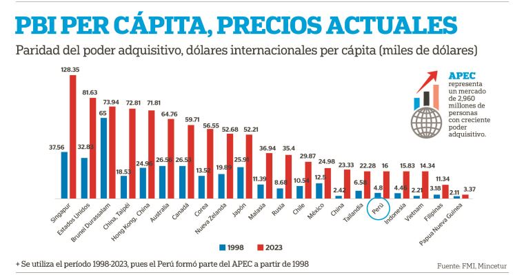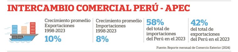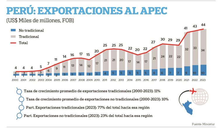 – En ese año, el Perú exportaba a las economías del APEC aproximadamente 3,000 millones de dólares. Al 2023, esa suma se ha multiplicado 14 veces, pues estamos exportando más de 44,000 millones de dólares. Si hablamos del total de las exportaciones globales, el 68.5% de los envíos peruanos se destinaron al área APEC.