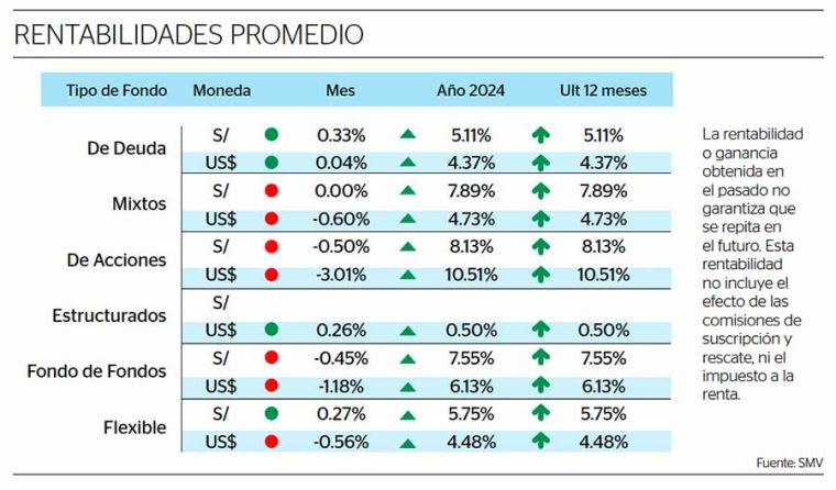 De acuerdo con las estadísticas de la Asociación de Administradoras de Fondos Mutuos del Perú, la rentabilidad promedio durante el 2024 de estos instrumentos de inversión en dólares fue desde el 0.50% (en el caso de los Fondos Estructurados) hasta el 10.51% (en el caso de los Fondos de Acciones).