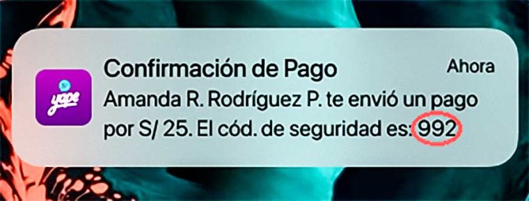 Además, el que recibe el yapeo también podrá visualizar el código de seguridad en la notificación que le llega por haber recibido un yapeo: